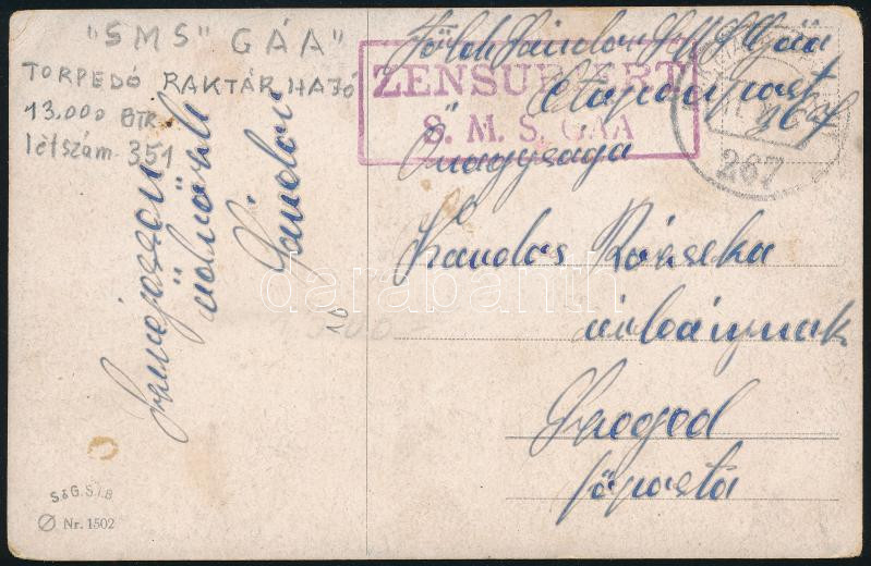 ~1918 Tábori posta képeslap / Field postcard "S.M.S. GÁA" https://www.darabanth.com/hu/45-Nagyaukcio/45.1/Magyar-filatelia-es-postatortenet-Online/I-Vilaghaborus-osztrak-magyar-tabori-posta-Haditengereszet~18750/7E1918-Tabori-posta-kepeslap-Field-postcard-SMS-GAA~II2845971