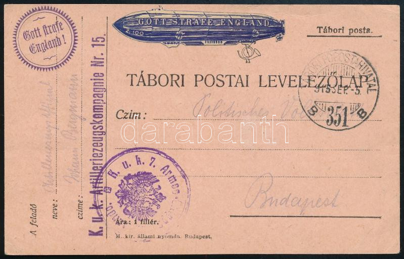 Leírás: 1915 Tábori posta levelezőlap / Field postcard "K.u.k. Artilleriezeugskompagnie Nr.15." + "K.u.k. 7. Armee-Gruppe" + "TP 351 B" + "Gott Strafe England!"