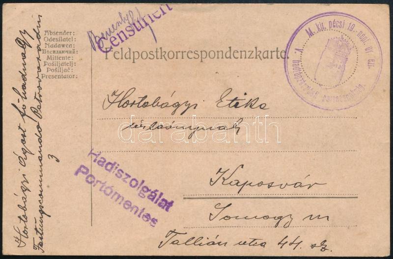1915 Tábori posta levelezőlap / Field postcard "M.kir. pécsi 19. ... https://www.darabanth.com/hu/45-Nagyaukcio/45.1/Magyar-filatelia-es-postatortenet-Online/I-Vilaghaborus-osztrak-magyar-tabori-posta~18748/1915-Tabori-posta-levelezolap-Field-postcard-Mkir-pecsi-19-nepf-gy-ezr-V-hadtapzaszl~II3444156
