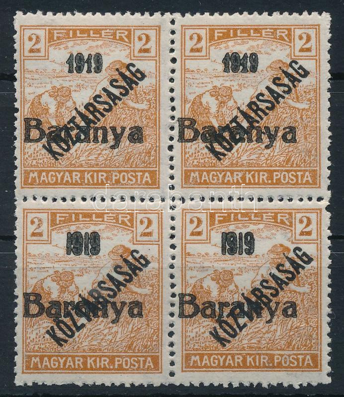 Leírás: Baranya I. 1919 Arató 2f négyestömb 2 bélyegen antikva számokkal / block of 4 with antiqua numbers
