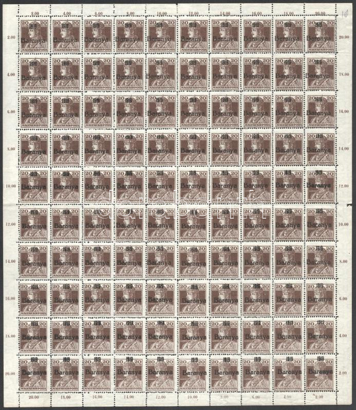 Leírás: Baranya I. 1919 Károly 20f hajtott teljes ív / complete sheet (elvált fogak, betapadás / aparted perfs, gum disturbance)