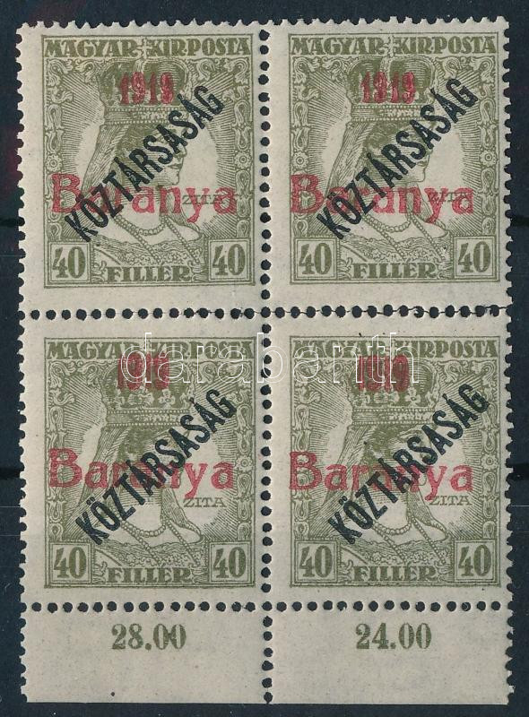 Leírás: Baranya I. 1919 Zita 40f négyestömb 2 bélyegen antikva számokkal (2 bélyegen törés) / block of 4 with antique numbers (folds)