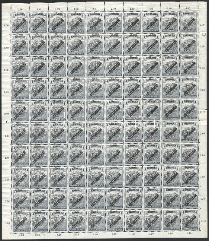 Nagyvárad 1919 Arató/Köztársaság 4f hajtott teljes ív lemezhibákkal. Teljesen elvált fogak, csak az ívszél tartja egyben (falccal megerősítve) / folded complete sheet with plate varieties. Aparted perforations, held together only by the margin (strenghtened by hinge)