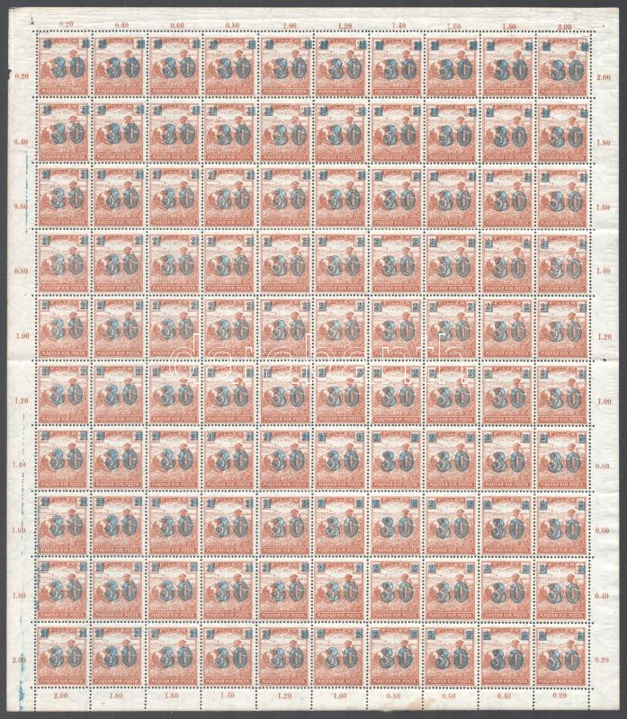 Leírás: Temesvár 1919 Arató 30f/2f hajtott teljes ív, szegélyléc lenyomattal, elcsúszásokkal, Bodor vizsgálójellel / Mi 6a folded sheet with shifted overprint. Sign: Bodor