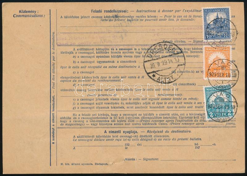 Leírás: 1929 Teljes csomagszállító 6 db bélyeggel, vámkezelve Koppenhágába / Parcel card to Copenhagen