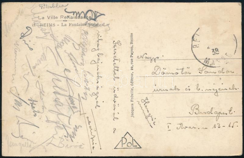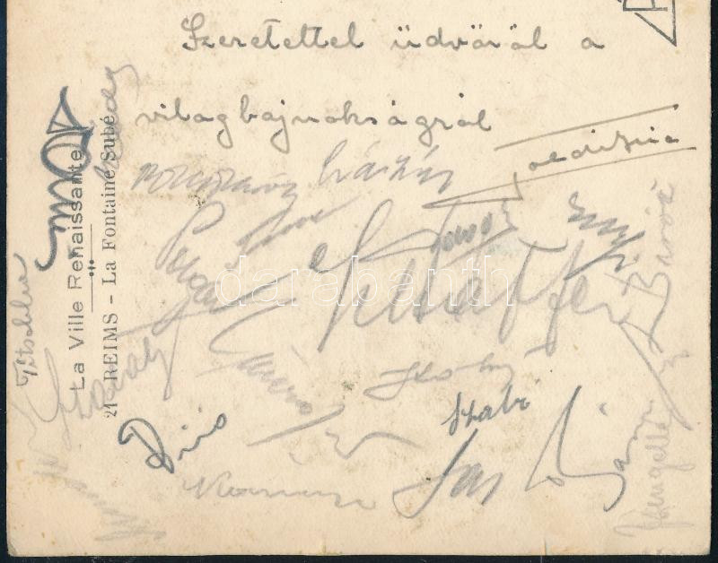 1938 Reims, a magyar labdarúgó-válogatott játékosai által aláírt képeslap, összesen kb. 20 db aláírással, köztük Toldi (Tunigold) Géza, Szalay Antal, Schaffer Alfréd (edző), Titkos Pál, Bíró Sándor, Korányi Lajos, Kohut Vilmos, Zsengellér Gyula és mások; Toldi Géza saját kezű soraival és címzésével sógora, Dömötör Sándor részére
