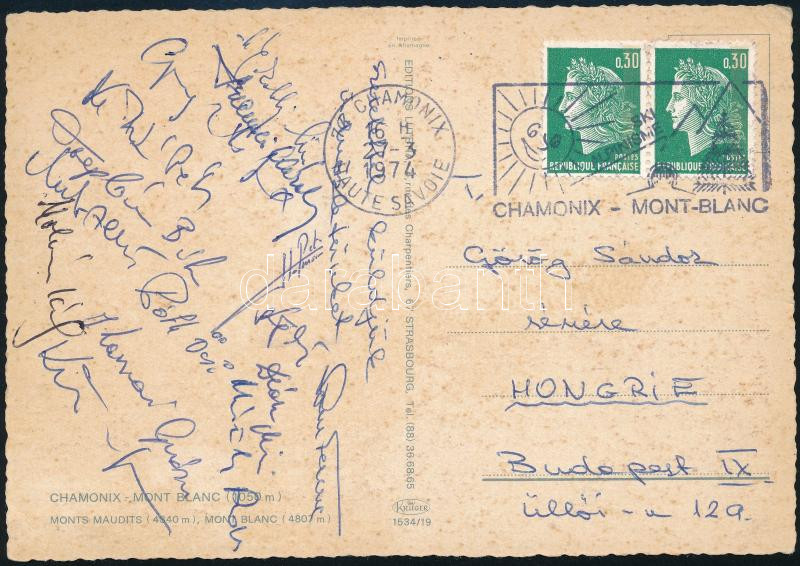 1974 Postcard from France signed by members of the Ferencváros ice hockey team: Póth öcsi, Dák, etc., Som Ferenc