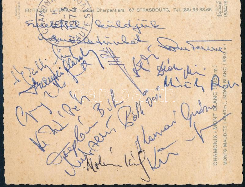 Leírás: 1974 A Ferencváros jégkorong tagjai által aláírt képeslap Francaországból: Póth öcsi, Dák, stb, Som Ferenc