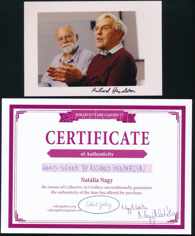 Richard Henderson skót biofizikus, aki 2017-ben megosztott kémiai Nobel-díjat kapott azért a technológiáért, amely lehetővé tette, hogy a tudósok nagy felbontásban lássák az élő sejtekben működő fehérjéket. Ez az áttörés nemcsak a kutatók számára fontos: az orvostudomány, a gyógyszerfejlesztés és a biológia alapjai váltak pontosabban érthetővé általa. Az aláírt fényképe nem csupán egy tudományos emléktárgy, hanem egy darabja annak a történetnek, amelyben a mikroszkopikus világ feltárul az emberi szem előtt.