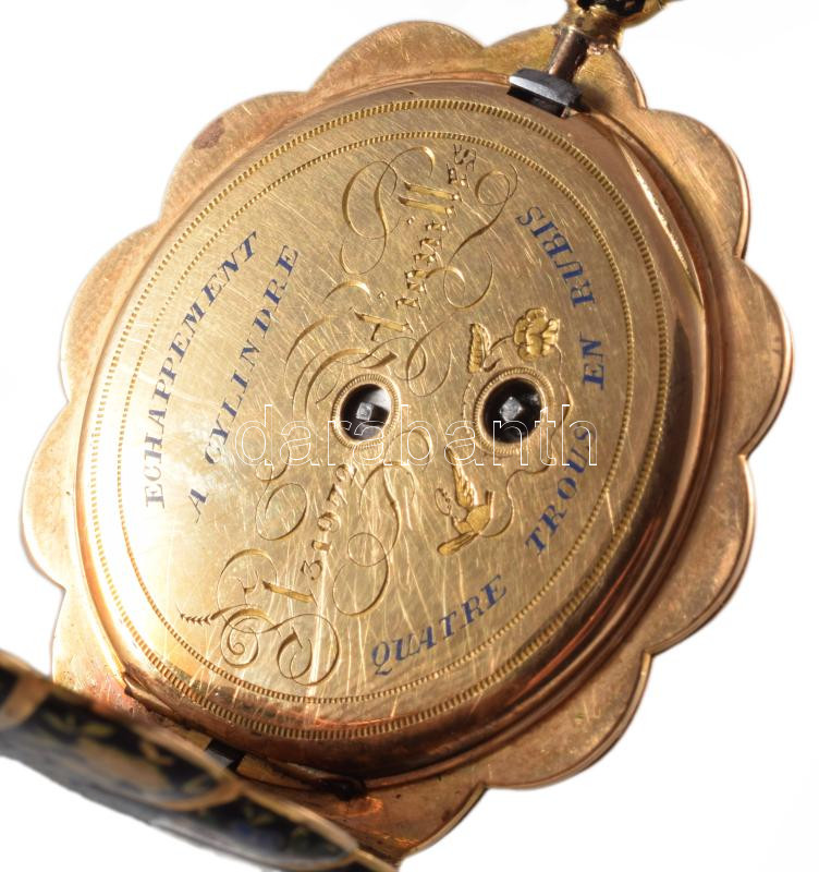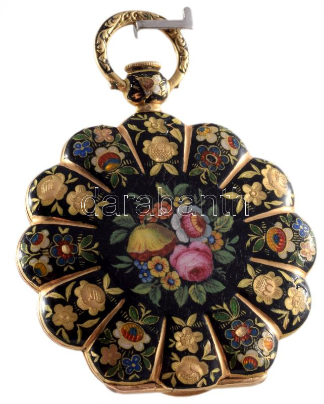 Női zsebóra. XIX. sz. közepe. 18K arany (Au) kézi zománcfestéssel. P. Aiguilles, jelzéssel, köves szerkezettel, kulccsal, működik d: 4 cm, br 27,9 g Women's pocket watch. Mid 19th century. 18K gold (Au) with hand enamel painting. P. Aiguilles, marked, stone mechanism, with key, works d: 4 cm, br 27.9 g