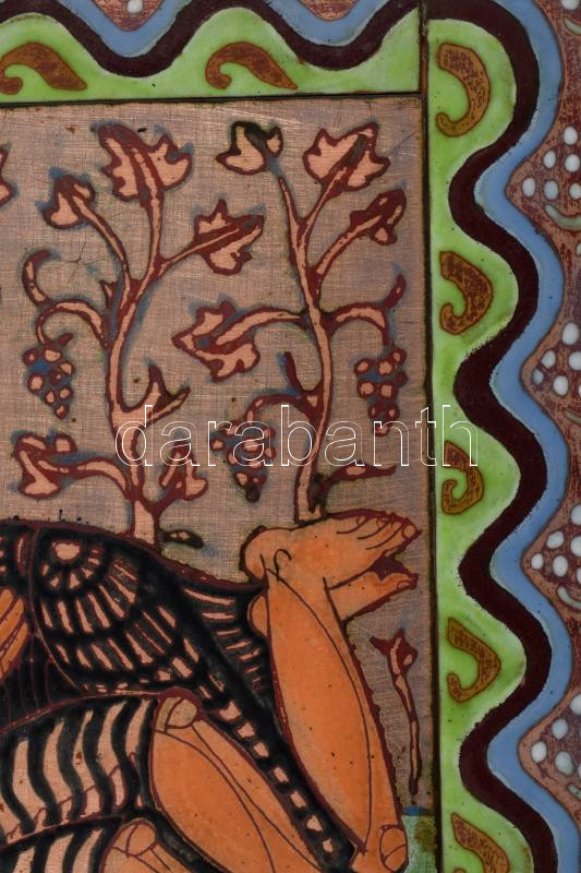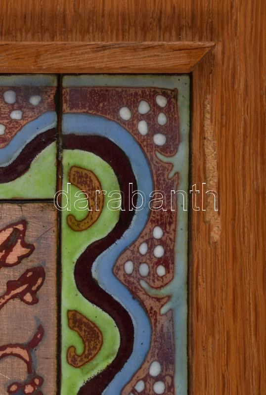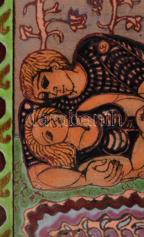 Stefániay Edit (1936-): Szerelmesek. Tűzzománc kép, kissé hiányos fa táblán, jelzett a hátoldalon, 20x20 cm /// Edit Stefániay (1936-): Lovers. Enamel painting on a slightly incomplete wooden board, signed on the reverse, 20x20 cm.