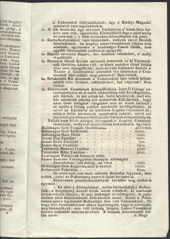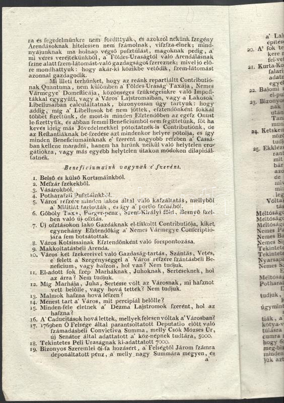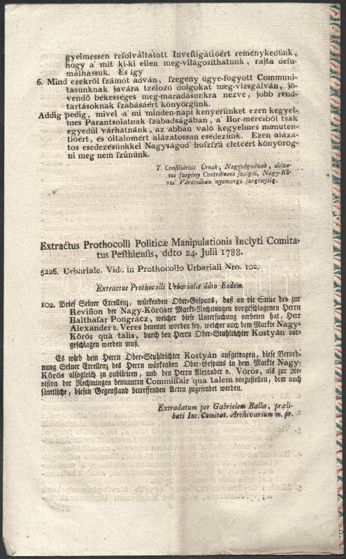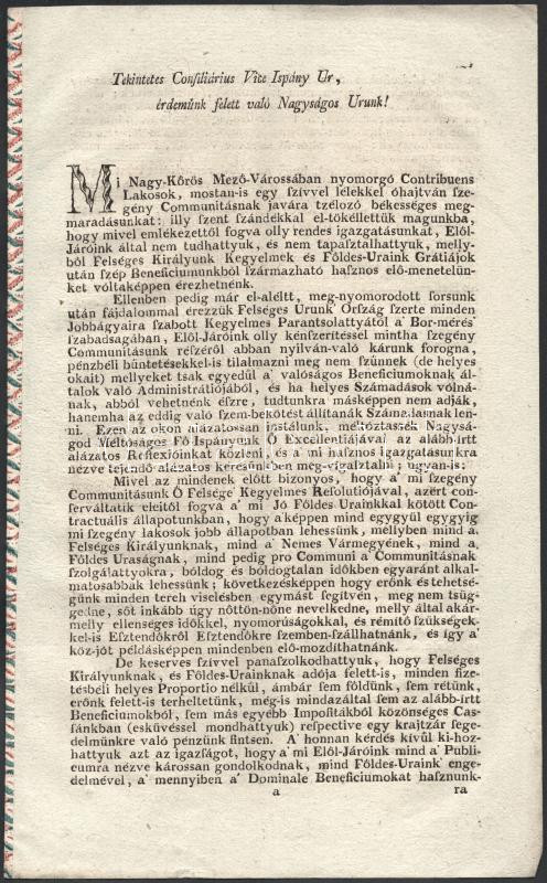 1788 Nagykőrös mezőváros lakosainak Pest vármegye alispánja elé terjesztett kérelme a város pénzügyi terheinek enyhítése tárgyában: ,,Mi Nagy-Kőrös Mező-Várossában nyomorgó Contribuens Lakosok [...] meg-nyomorodott sorsunk után fájdalommal érezzük Felséges Urunk' Ország szerte minden Jobbágyaira szabott Kegyelmes Parantsolattyától a Bor-mérés szabadságában, Elől-Járóink olly kénszerítéssel mintha szegény Communitasunk részéről abban nyilván-való kárunk forogna, pénzbéli bűntetésekkel is tilalmazni meg nem szűnnek [...]", 6 p.