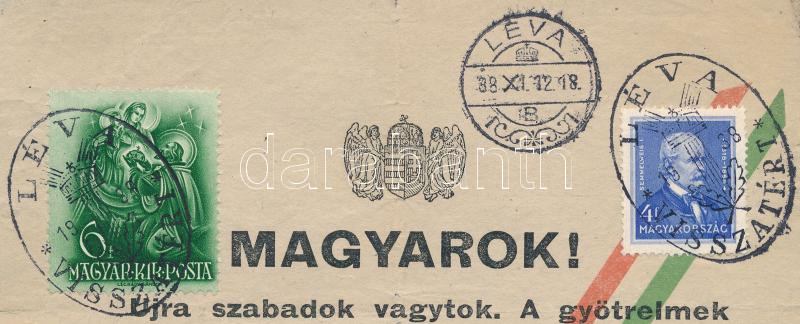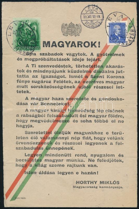 1938 A Felvidék visszacsatolása alkalmából kiadott "Magyarok!" című dekoratív szórólap Horthy Miklós Magyarország kormányzója nevében, Léva visszatér pecsétekkel, szép állapotban