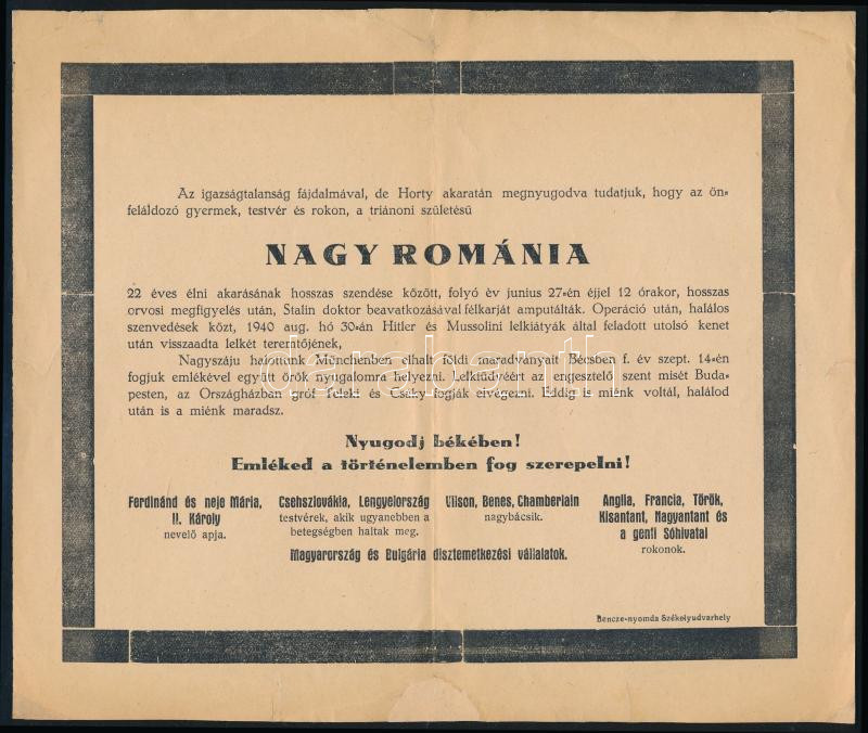 1940 Nagy Románia gyászjelentése ironikus formában, restaurálva, 19×23... https://www.darabanth.com/hu/45-Nagyaukcio/45.1/Mutargy-papirregiseg-egyeb/Nyomtatvanyok~18978/1940-Nagy-Romania-gyaszjelentese-ironikus-formaban-restauralva-19C39723-cm~II3446559