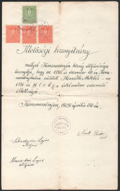 1907 Illetőségi bizonyítvány 3 x 10f + 50f illetékbélyeggel "KEME... https://www.darabanth.com/hu/45-Nagyaukcio/45.1/Mutargy-papirregiseg-egyeb/Okmanyok~18546/1907-Illetosegi-bizonyitvany-3-x-10f-plus-50f-illetekbelyeggel-KEMENESSOMJEN~II3435187