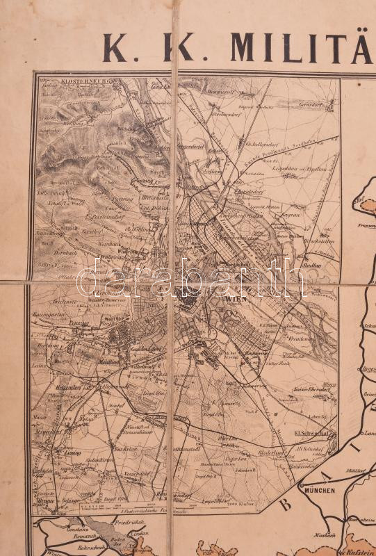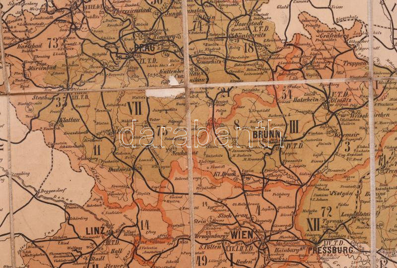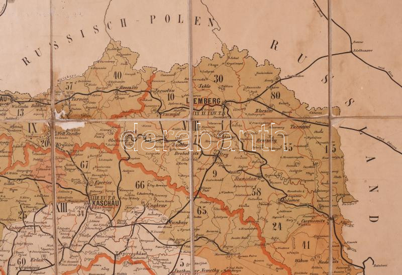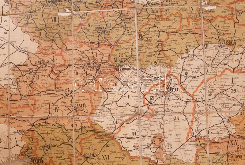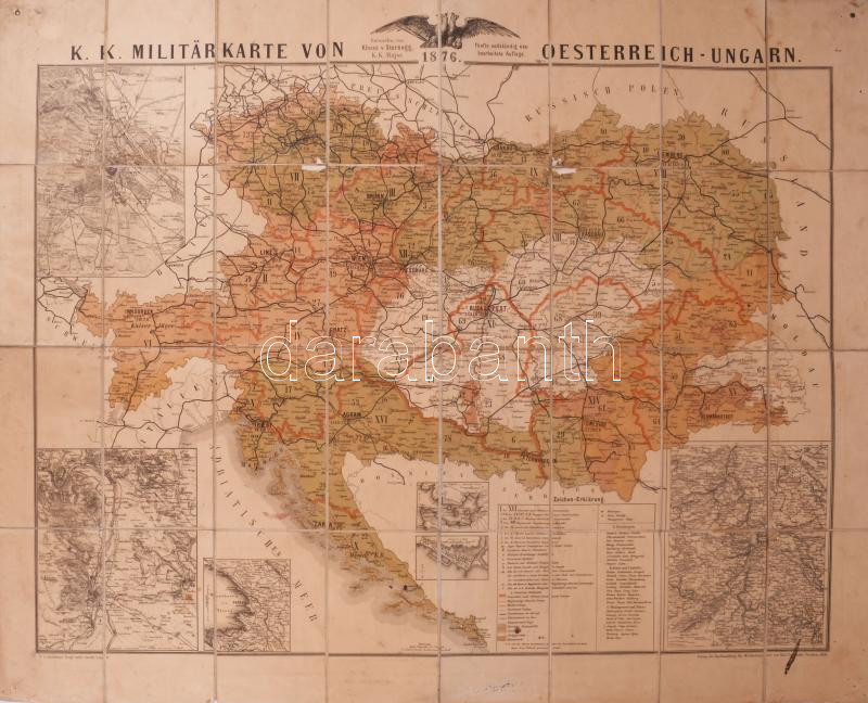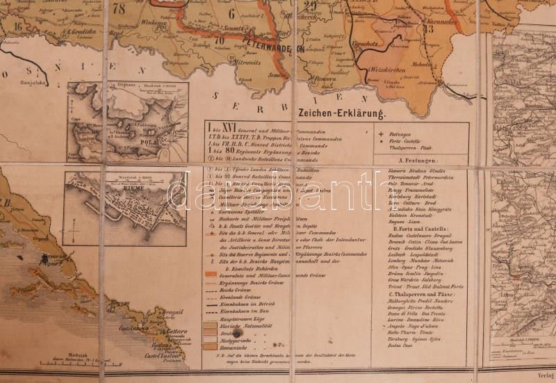 Az Osztrák-Magyar Monarchia katonai térképe, rajta a XVI katonai parancsnokság, 6 kisebb méretű fekete-fehér térképe, (Bécs és környéke, Budapest és környéke, Prága és környéke, Trieszt, Pula, Fiume városok térképei), rajta a 80 katonai ezred állomáshely megjelölésével, vasútvonalak, laktanyák, várak, erődök, erődítmények, kastélyok, gátak, víztározók, hágók, átjárók, szorosok jelölésével. A katonai egységek nemzetiségek (szláv, német, magyar, román) szerinti feltüntetésével. Ritka!