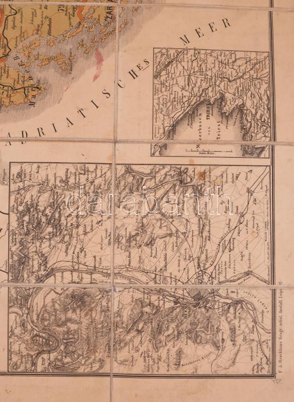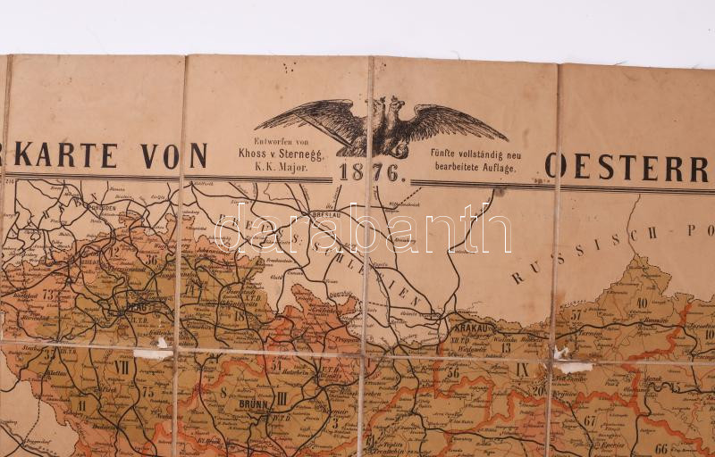 1876 K. K. Militärkarte von Oesterreich-Ungarn. Entworfen von Khoss v. Sternegg, K. K. Major. Fünfte vollstandig neu bearbeitete Auflage. Teschen, 1876., Verlag der Buchandlung für Militarliteratur von Karl Prochaska,(F. A. Brockhaus' Geogr.-artist. Anstalt.-ny.), nagyméretű színes, kőnyomatú térkép, vászonra kasírozva, foltos, a sarkain lyukakkal, a szelvényeken 4-5 helyen sérüléssel, 69x86 cm.