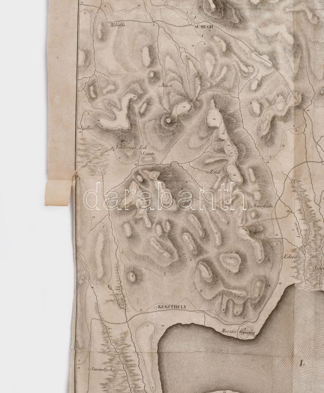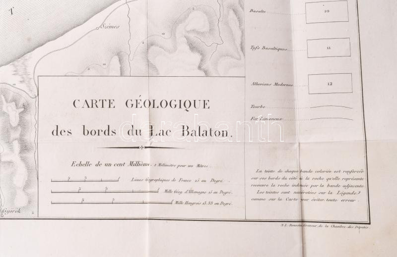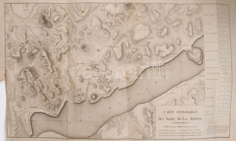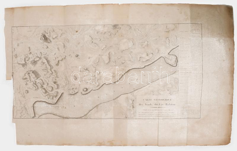 A Balaton rézmetszetes geológiai térképe 1813-ból. Az első önálló lap, amely a Balatont ábrázolja. Megjelent: Francois Sulpice: "Voyage mineralogique et geologique en Hongrie, pendant l'année 1813" című munkájában (Paris, 1822, Verdiére.) jelent meg. [M=1:100.000.] Lapméret: 57×78 cm. Hajtva. Jó állapotú lap. Szép példány. Nagyon ritka!