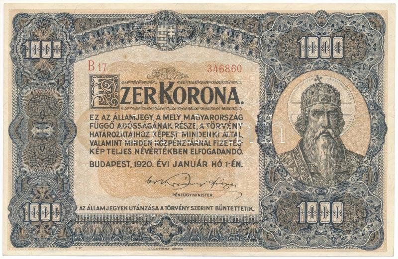 Hungary 1920. 1000 Korona with "Orell Füssli Zürich " printer's mark, with "B17 346860" serial number C:F, fine paper, tiny spot