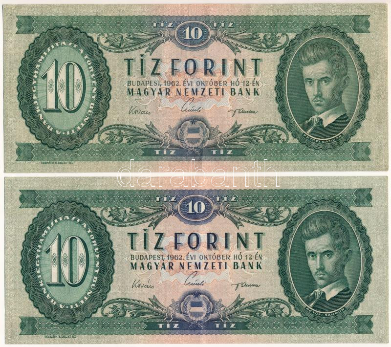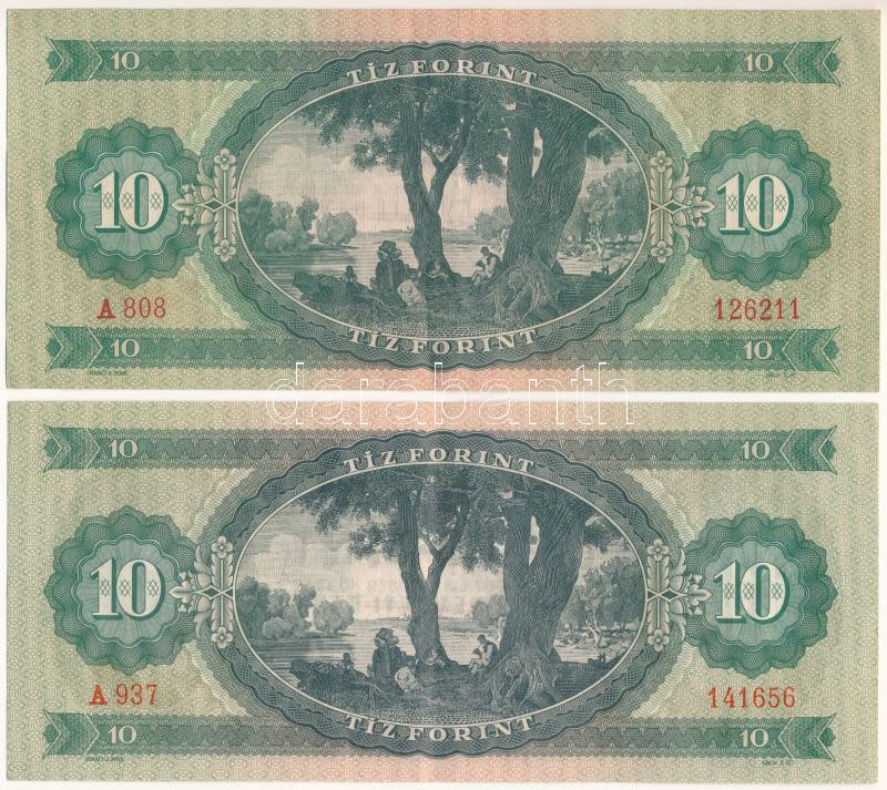1962. 10Ft (2xklf) "A 808 126211" fordított hátlapi "01"-es alapnyomattal + "A 937 141656" normál alapnyomattal T:XF,F, szép papír / Hungary 1962. 10 Forint (2xdiff) one normal issue, another one with underprint error "01" instead of "10" C:XF,F, fine paper
