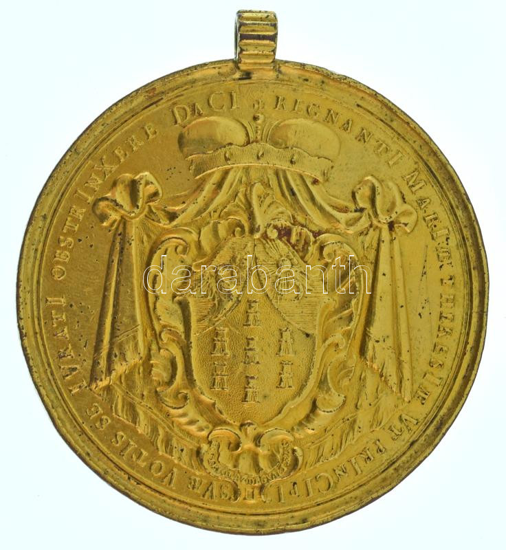 1741. Erdély hódolata Mária Teréziának, aranyozott bronz emlékérem, füllel. "COELO NUMEN HABES TERRAS REGINA TUETUS SIC COELO ET TERRIS HUNGARE TUTUS ERIS / REGNANTI MARIAE THERESIAE VT PRINCIPI SVAE VOTIS SE IVRATI OBSTRINEXERE DACI" (87,45g/70mm) T:XF,VF kissé kopott aranyozás a leginkább kiemelkedő részeken és a perem egy pontján / Hungary 1741. Homage of Transylvania to Maria Theresia, gilt bronze commemorative medallion with added ear. "COELO NUMEN HABES TERRAS REGINA TUETUS SIC COELO ET TERRIS HUNGARE TUTUS ERIS / REGNANTI MARIAE THERESIAE VT PRINCIPI SVAE VOTIS SE IVRATI OBSTRINEXERE DACI" (87,45g/70mm) C:XF,VF worn gold plating at points and on the edge