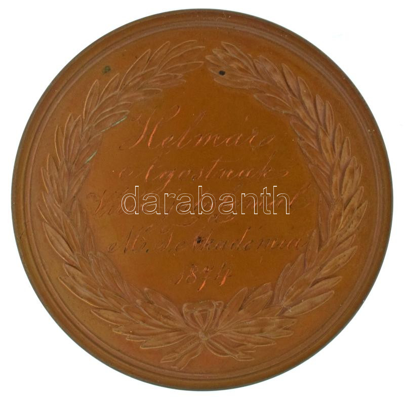 1874. "Borúra derű (A Magyar Tudományos Akadémia Nagydíja)" kétoldalas bronz érdemérem, hátoldalán "Helmár Ágostnak Vitéz jutalomal a M. T. Akadémia 1874" gravírozással. Az árverésen szereplő díjat Helmár Ágost (Pozsony, 1847. szeptember 3. - Pozsony, 1912. március 5.) királyi főgimnáziumi tanár kapta. Szign.: "J. D. BOEHM F." (45mm) T:AU /