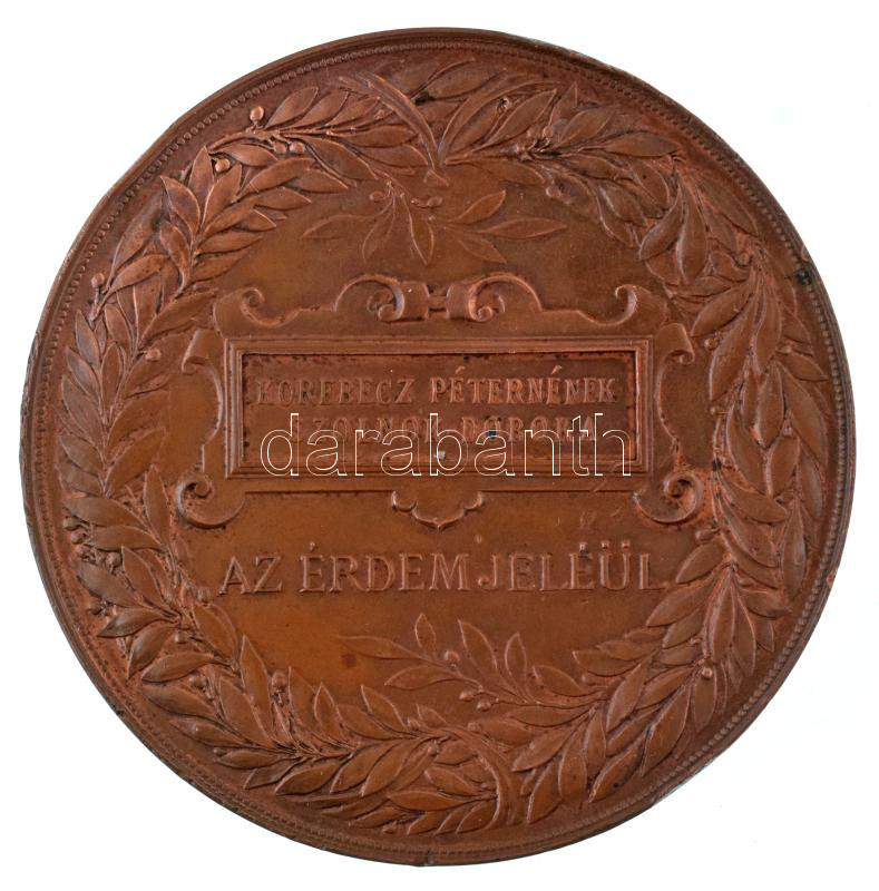 Hungary 1885. "Országos Általános Kiállítás Budapesten 1885 / Korebecz Péternének, Szolnok-Doboka - Az érdem jeléül (National Exposition at Budapest in 1885 / For Mrs. Peter Korebecz from Szolnok-Doboka - As the Sign of Merit)" bronze commemorative medallion. Sign.: István Schwartz (65mm) C:XF patina, multiple smaller edge errors