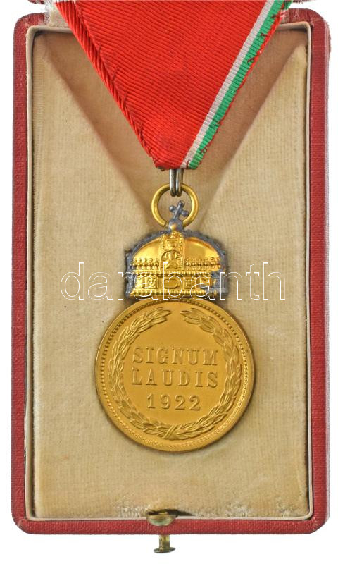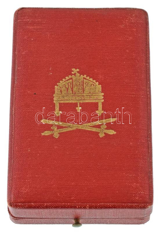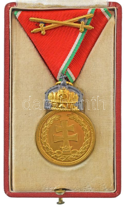 1922. "Magyar Koronás Bronzérem hadiszalagon, kardokkal" aranyozott bronz kitüntetés mellszalagon, peremén "BRONZ" jelzés, eredeti dÃsztokban T:AU aranyozás kopott a koronán / Hungary 1922. "Hungarian Bronze Medal with the Holy Crown with swords on war ribbon" gilt bronze decoration with ribbon, with "BRONZE" mark on edge, in original case C:AU gold plating worn on crown