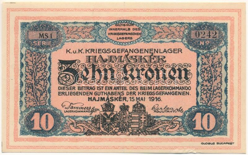 Hajmáskér / hadifogolytábor 1916. május 15. 10K arab sorozat és sorszámozás, "MS" jelzéssel, "1 0242" sorszámmal T:AU / Hungary / Hajmáskér / POW camp 15.05.1916. 10 Kronen with Arabic series and serial numbers, "MS" and "1 0242" serial number C:AU