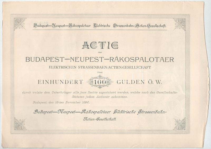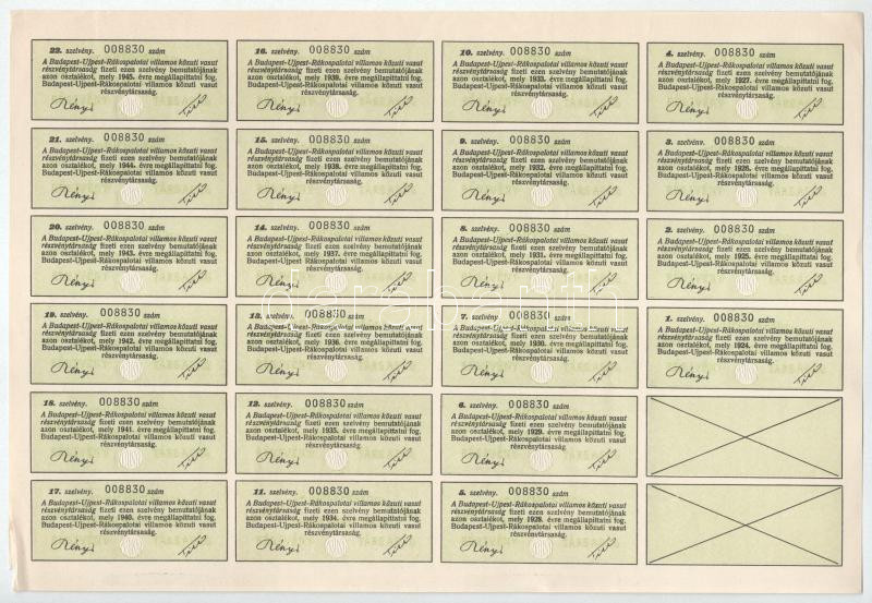 Budapest 1894. "Budapest - Ujpest - Rákospalotai Villamos Közuti Vasut Részvény-Társaság" részvénye 100Ft-ról/200K-ról szárazpecséttel, szelvényekkel T:XF csak hajlásnyom, kis szakadások