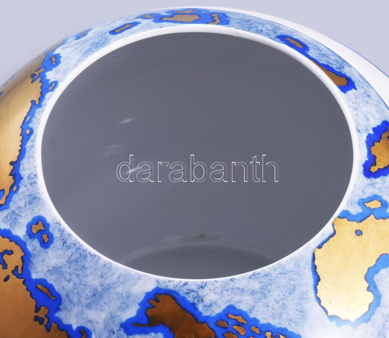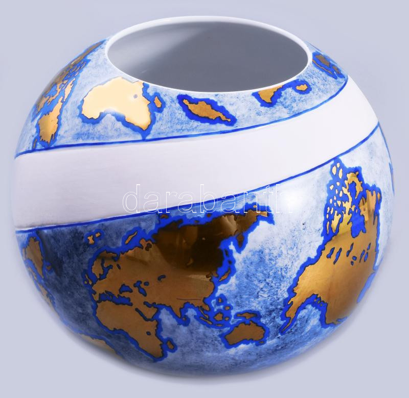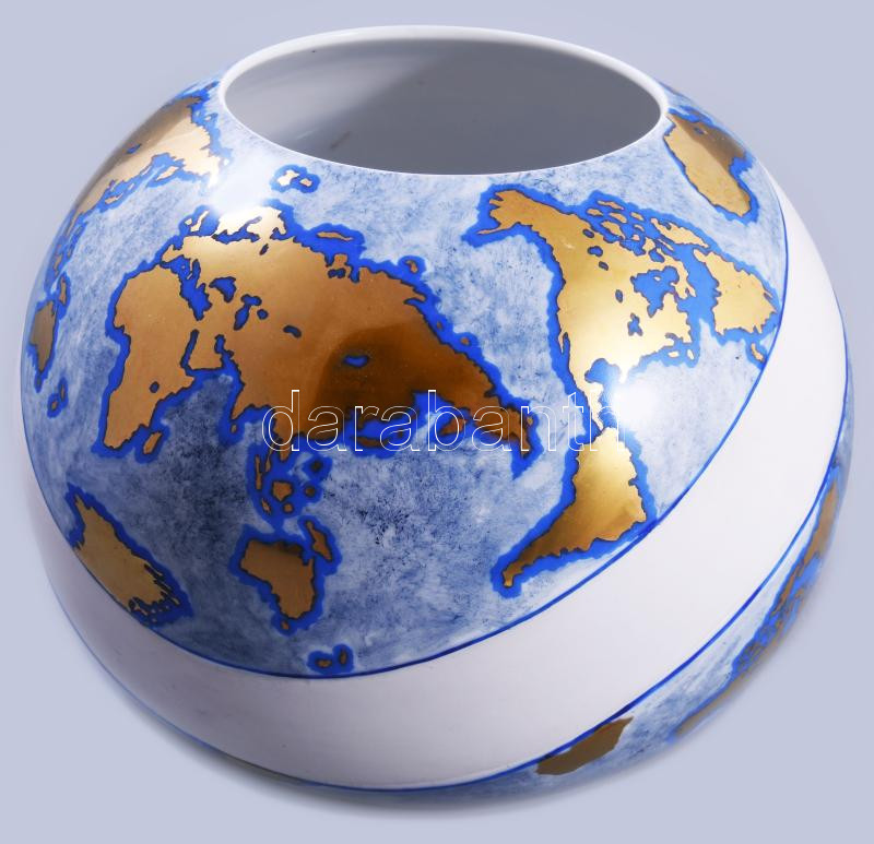 Hollóházi Manufaktúra, Gulyás Kati (1945-) képzőművész: Váza világtérkép dekorral. cca 1998, kísérleti darab, jelzett, hibátlan, d: 19 cm, m: 15 cm. Hozzá Gulyás Kati porcelán kollekciójának füzetével. /// Hollóháza Manufactory, Kati Gulyás (1945-) fine artist: Vase with world map decoration. ca. 1998, Experimental piece, marked, flawless, diameter: 19 cm, height: 15 cm. Accompanied by the booklet of Kati Gulyás's porcelain collection
