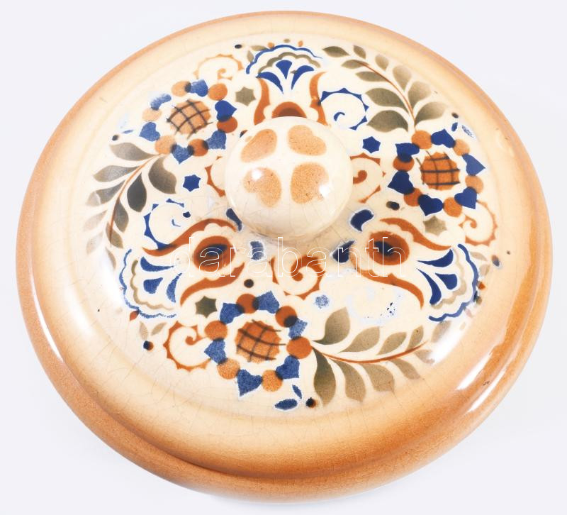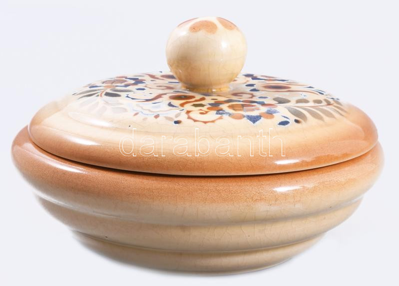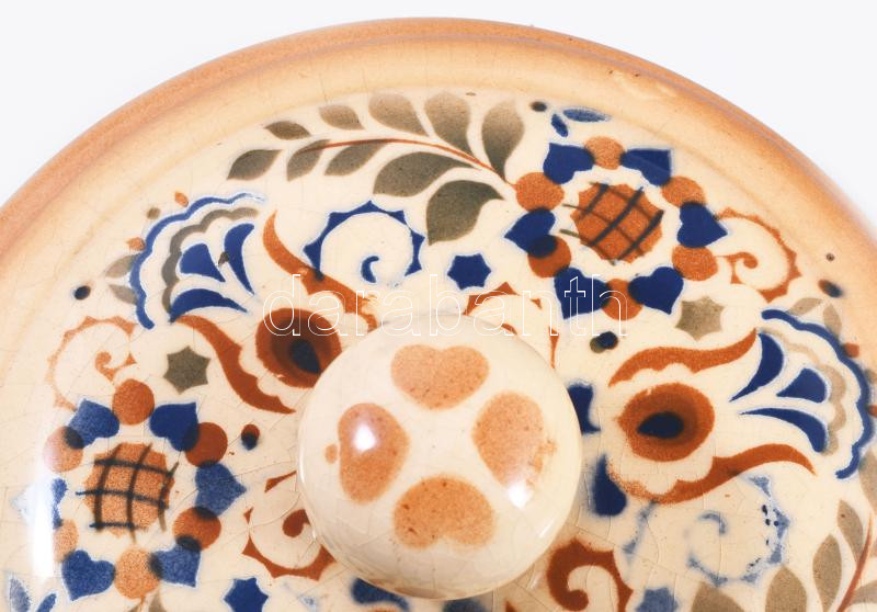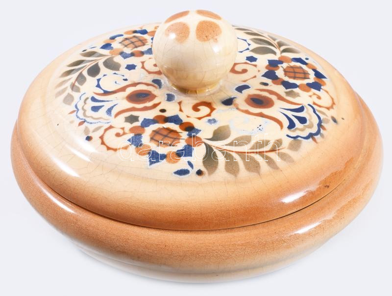 Zsolnay art deco magyaros mintás fedeles edény. Jelzett, mázrepedéssel, d: 18,5 cm, m: 10,5 cm /// Zsolnay art deco magyaros mintás fedeles edény. Jelzett, mázrepedéssel, d: 18,5 cm, m: 10,5 cm /// Zsolnay Art Deco lidded vessel with Hungarian-style pattern. Marked, with glaze crazing, d: 18.5 cm, h: 10.5 cm