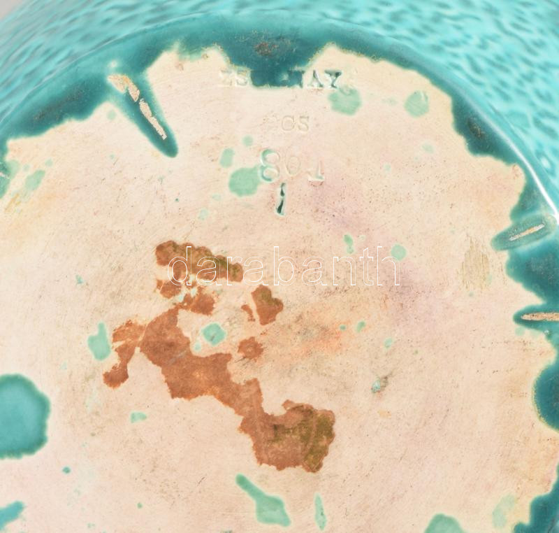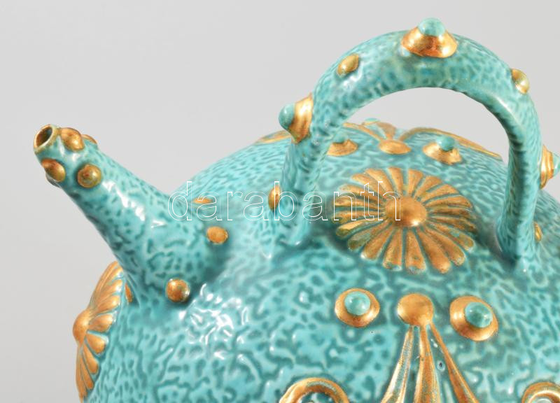 cca 1885 Zsolnay aszkosz. Korongozott és kézzel formált, plasztikus elemekkel díszített porcelánfajansz. Tigermázas türkiz alapon aranyozott plasztikus díszítmények. Alján jelzett: masszába nyomott Zsolnay Pécs és 681 formaszám. Kis aranykopással, m: 26 cm /// Circa 1885 Zsolnay askos. Wheel-thrown and hand-formed porcelain faience, decorated with plastic (relief) elements. Tiger-glazed turquoise base with gilded relief decorations.