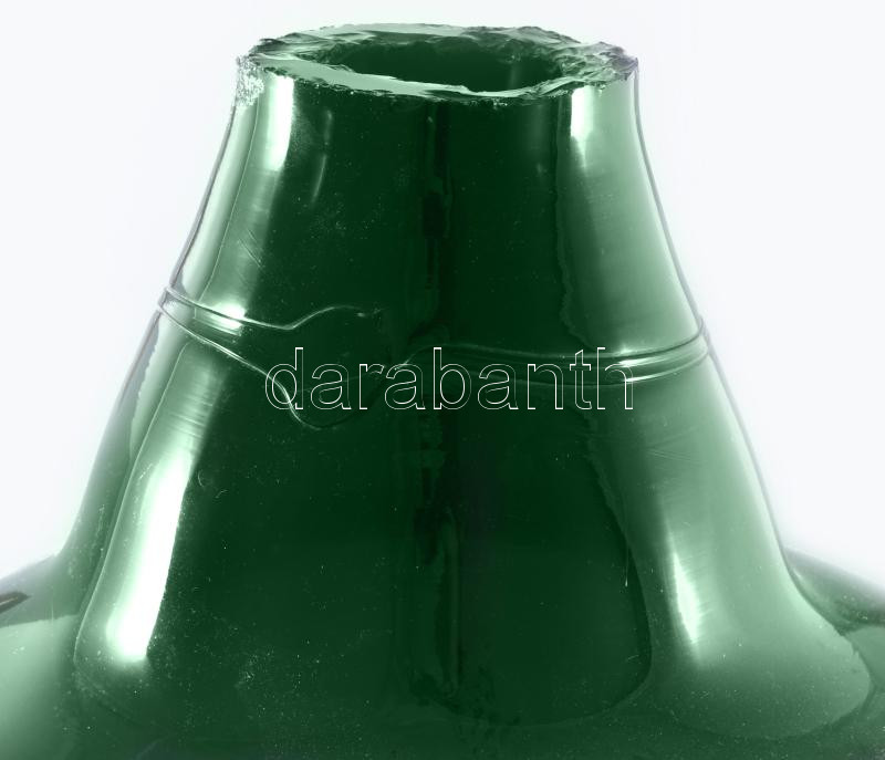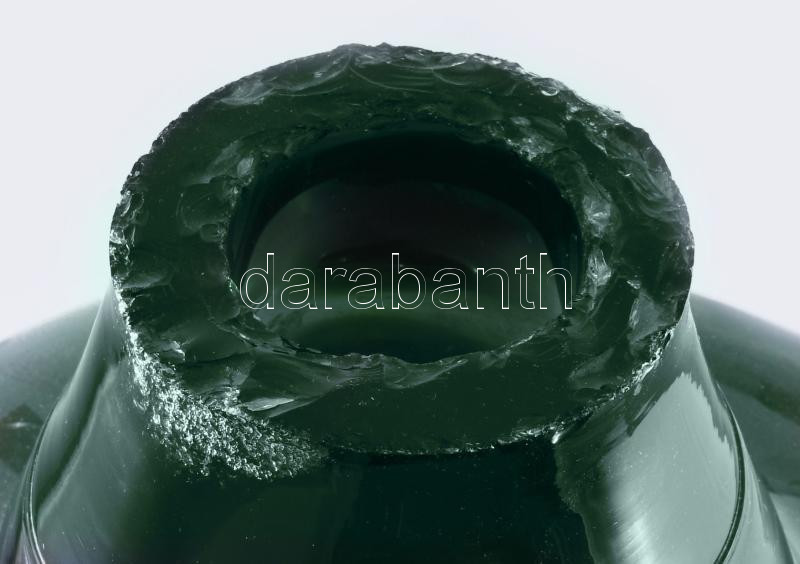 Borérlelő üvegballon. cca 19. sz. vége, Parád, zölden színezett hutaüveg, cca 50 liter, kis kopással, m: 53 cm. A hasonló érlelő ballonok száját egy speciális szerszámmal durván képezték ki, hogy alkalmasak legyenek a borérlelési technikák kivitelezésére. /// KIZÁRÓLAG SZEMÉLYES ÁTVÉTEL, NEM POSTÁZZUK / ONLY PERSONAL COLLECTION IN OUR OFFICE! /// Wine aging glass balloon. Circa late 19th century, Parád, green-colored furnace glass, approximately 50 liters, with minor wear, height: 53 cm. The mouths of similar aging balloons were roughly shaped with a special tool to make them suitable for executing wine aging techniques.