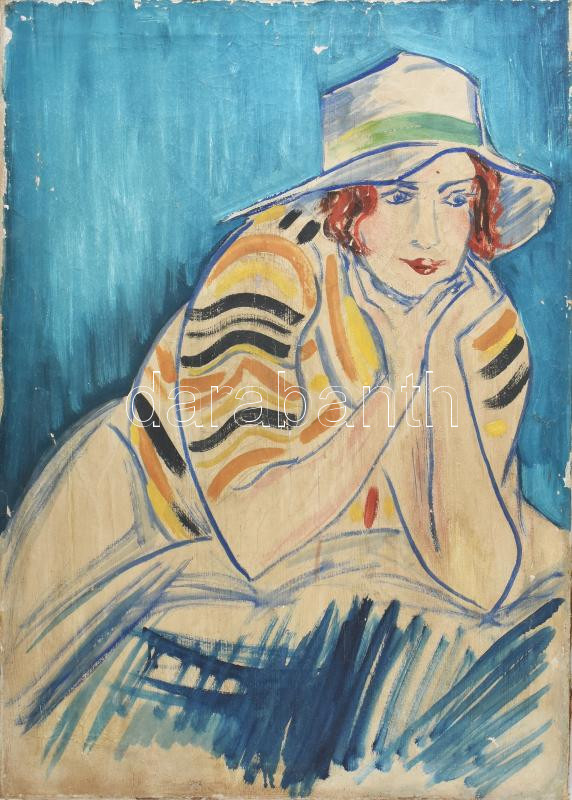 Leírás: Jelzés nélkül: Kalapos hölgy portréja. Olaj, vászon. Felületi sérüléssel. 70x50 cm