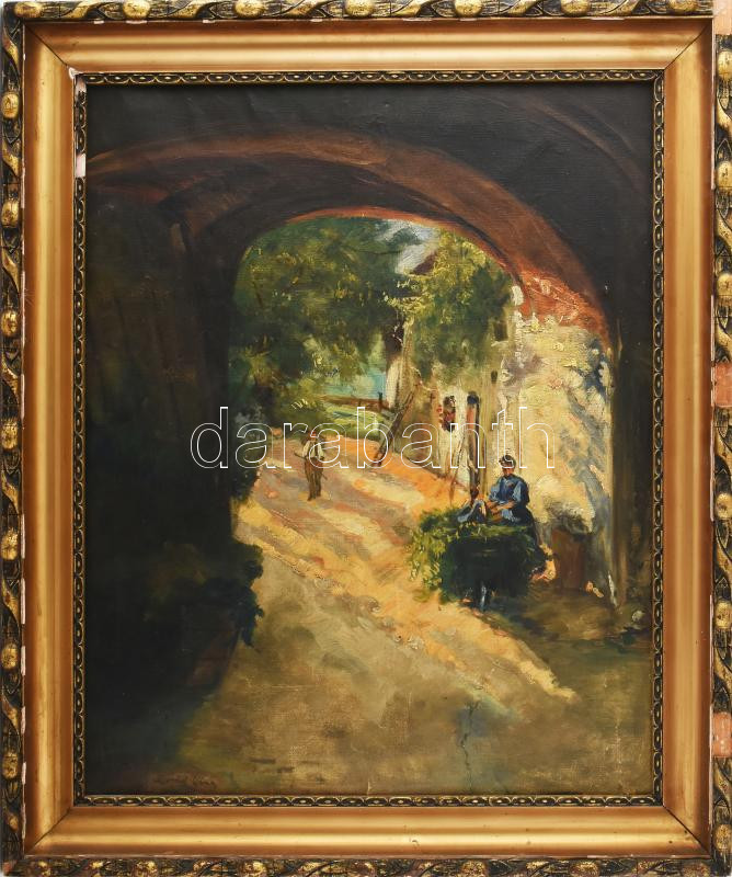 Leírás: Zórád Géza jelzéssel: Napfényes udvar. Olaj, vászon. Javított, sérült. Dekoratív, sérült fakeretben. 68x55,5 cm