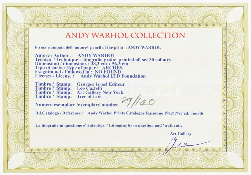 Andy Warhol (1928-1987): John Lennon. Ofszet litográfia, papír, jelzett a nyomaton. Kézzel sorszámozott: 29/100, jelzett a nyomaton. Georges Israel editeur - Leo Castellli New York, szárazpecséttel, tanúsítvánnyal / Ofset Lithography on paper, with certificate 43,5x36 cm