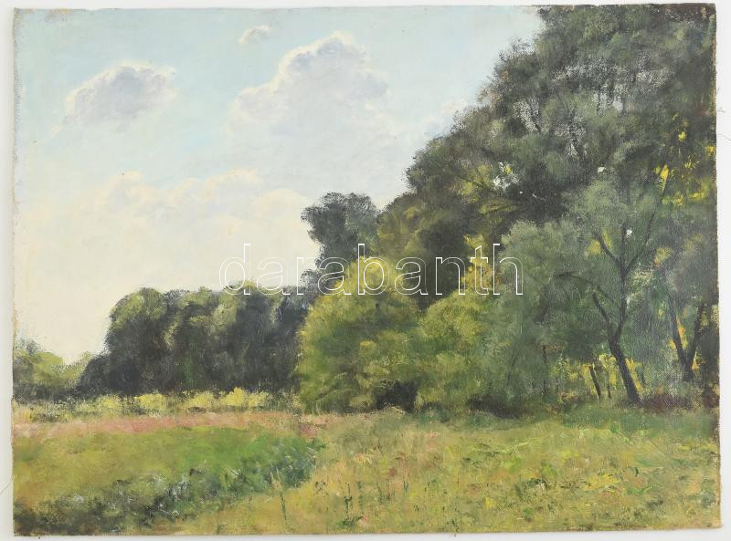 Leírás: Sárdy Brutus (1892-1970): Napfényes táj. Olaj, vászon, vakráma nélkül, jelzés nélkül 42x56cm