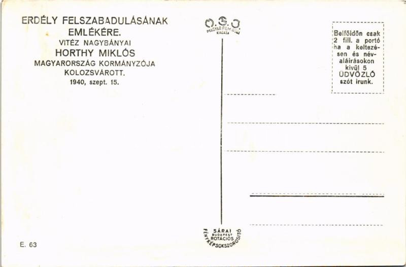 Leírás: 1940 Kolozsvár, Cluj; bevonulás, Vitéz Nagybányai Horthy Miklós Magyarország kormányzója / entry of the Hungarian troops, Regent Horthy