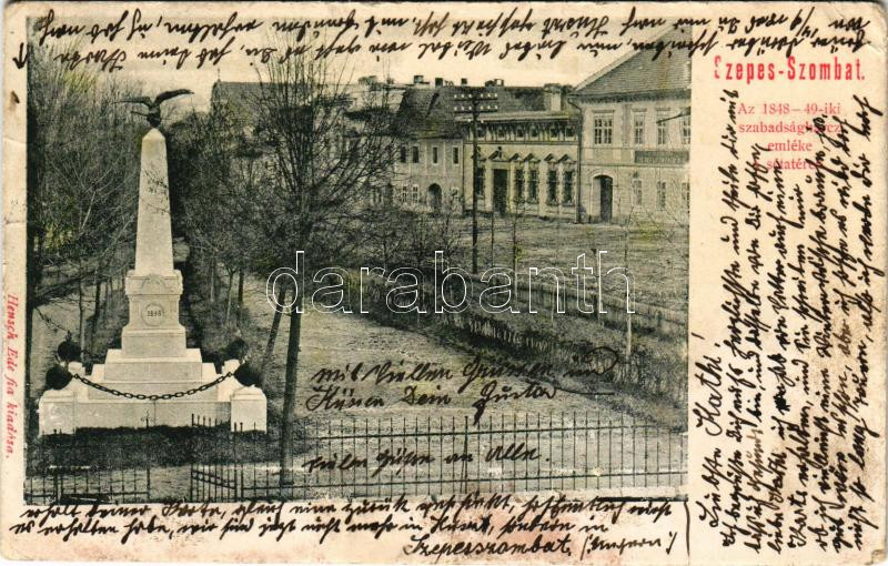 1914 Szepesszombat, Spisská Sobota; Az 1848-1849-es szabadságharc emlékére emelt honvéd emlékoszlop a sétatéren. Hensch Ede fia kiadása / monument of the 1848-49 Hungarian Revolution Heroes (EK)
