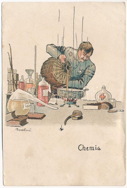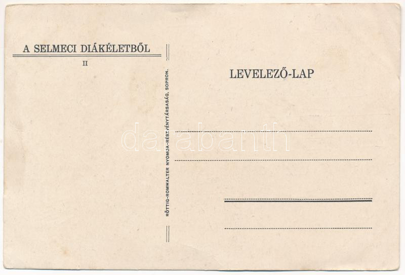 Selmecbánya, Schemnitz, Banská Stiavnica; Chemia. A Selmeci Diákéletből II. Studentika. Röttig-Romwalter nyomda rt. Sopron / Studentica art postcard s: Bartha L. (ázott / wet damage)