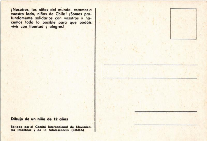Solidaridad. Nosotros, los ninos del mundo, estamos a vuestro lado, ninos de Chile! Dibujo de un nino de 12 anos / Chile-i háborús propaganda a gyermekek védelmében / Chilean child protection propaganda, war - MODERN
