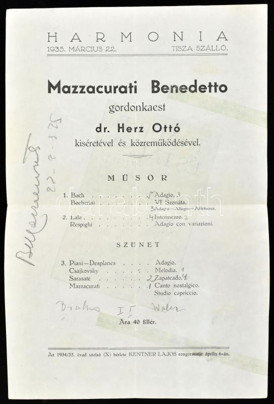 Leírás: Kis zenei aláírás-gyűjtemény: Gina Cigna énekes, Győry Béla, Kentner Lajos zongorista, Mazzacurati Benedetto gordonkás autográf aláírásai