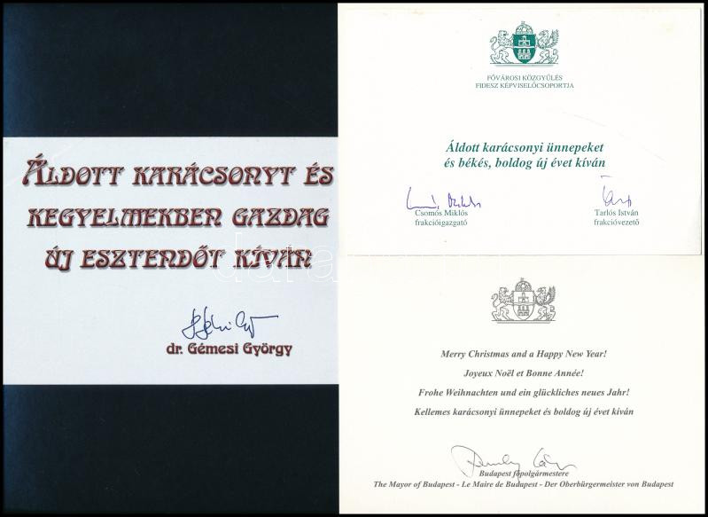 Tarlós István és Demszky Gábor volt budapesti főpolgármesterek autográf aláírásai üdvözlőlapokon + Gémesi György, Gödöllő polgármesterének nyomtatott aláírásával ellátott üdvözlőlap