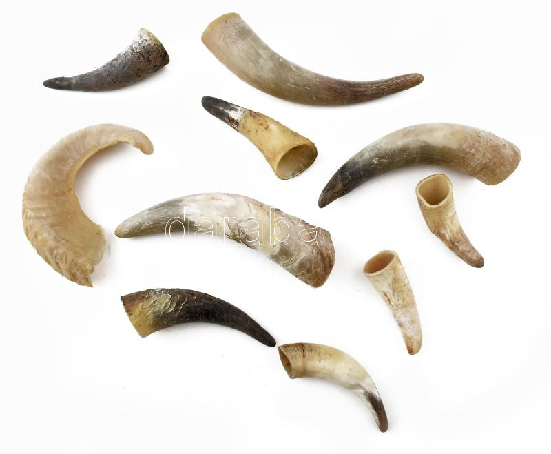 Leírás: 10 db szarv, közte 9 szarvasmarha és 1 merinó juh szarv, h: 9,5 - 24 cm