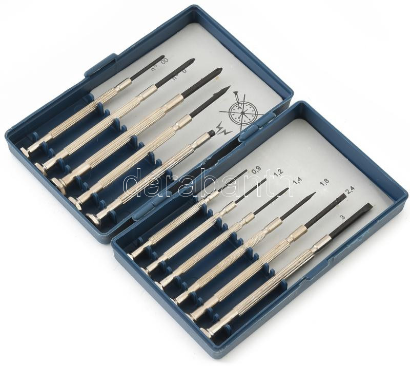Leírás: 11 darabos műszerész csavarhúzó készlet, egyik sérült, dobozban