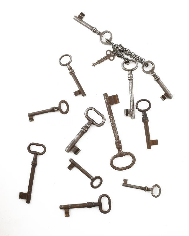 Leírás: 12 darab antik kamrakulcs, h: 7-16 cm