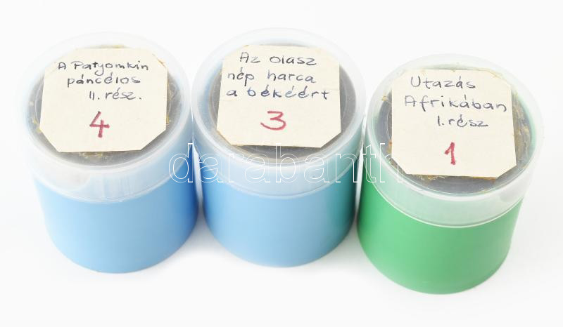 Leírás: 3 db diafilm (Az olasz nép harca a békéért, A Patyomkin páncélos 2. rész, Utazás Afrikában 1. rész)