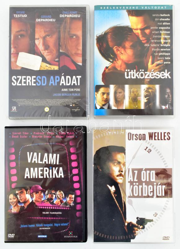 4 db film DVD: Szeresd Apádat (2002 Családi dráma), Ütközések (2004 Filmdráma/Krimi), Valami Amerika (2002 Romantikus vígjáték), Az óra körbejár (1946 Noir/Thriller)