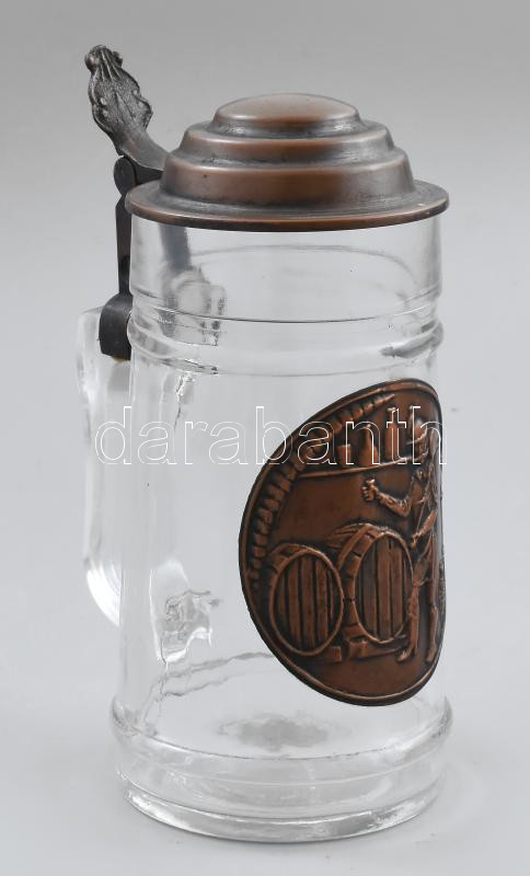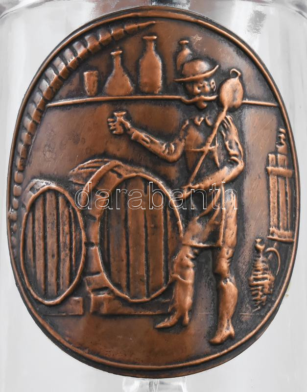 Leírás: Fém fedeles üveg kupa boros jelenetet bemutató plakettel. 19 cm
